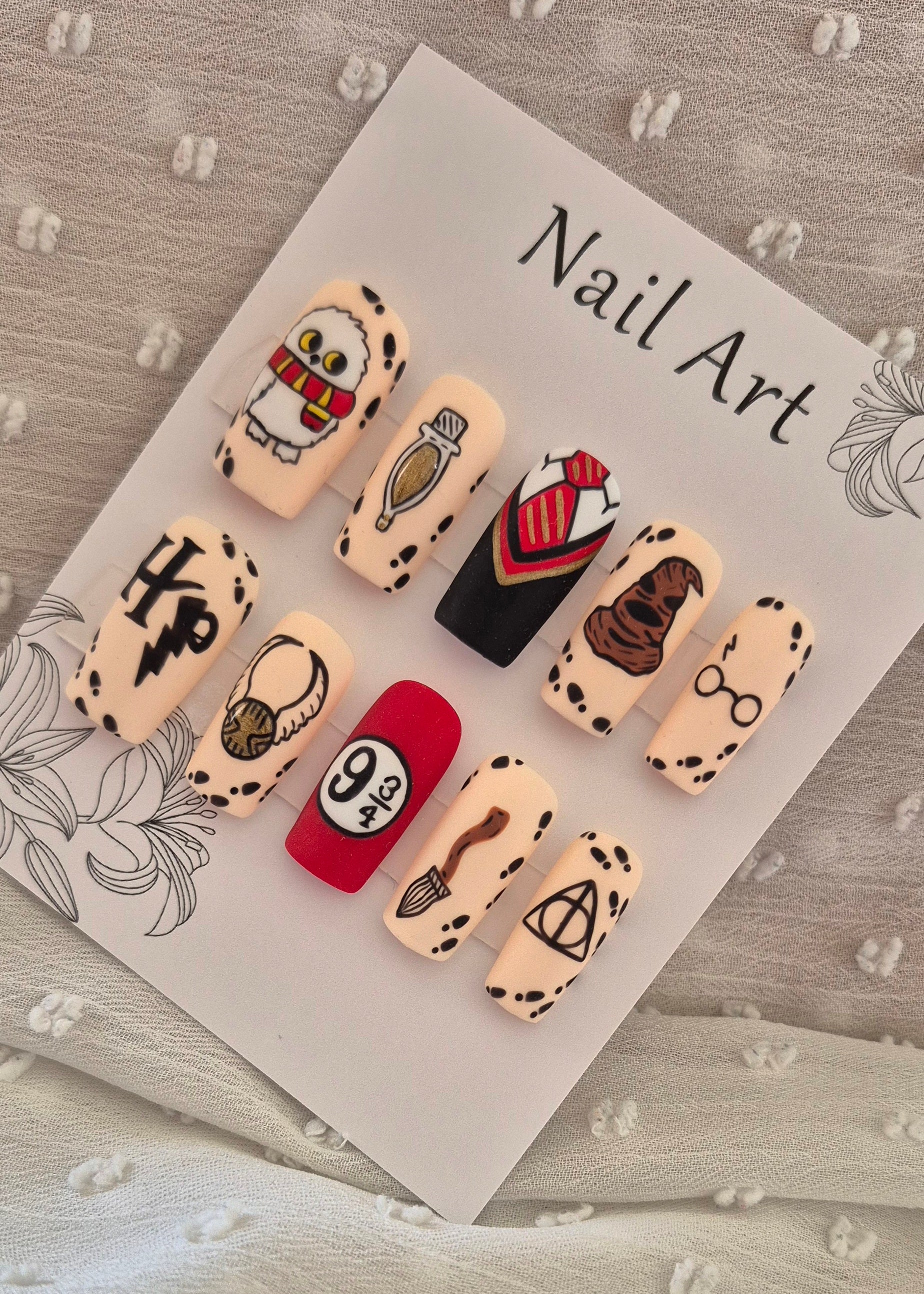 Chaque ongle est un clin d'œil à la saga culte : l'éclair d'harmonie, la baguette magique, les couleurs des maisons et des détails d'ores comme sortis d'un grimoire 👓