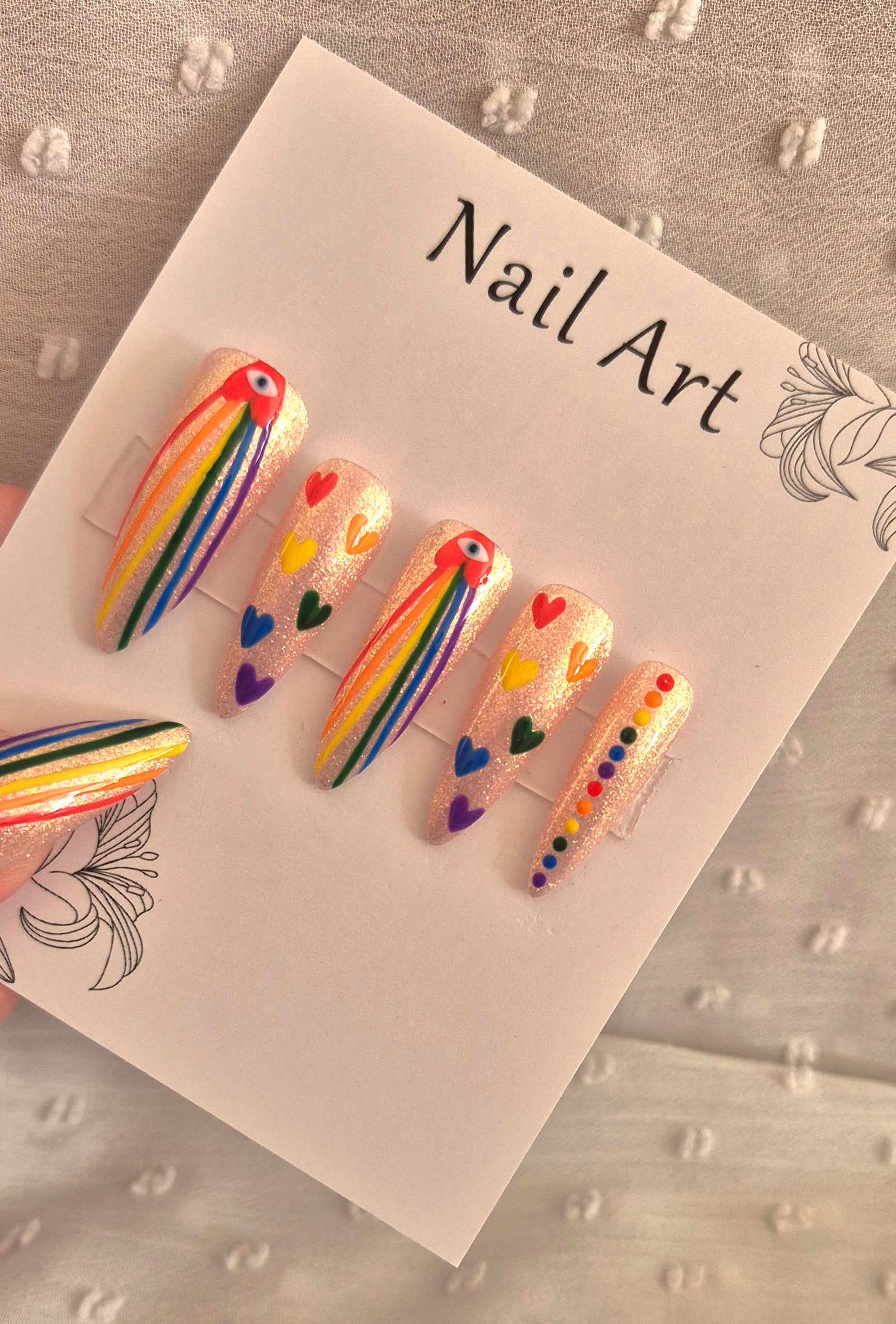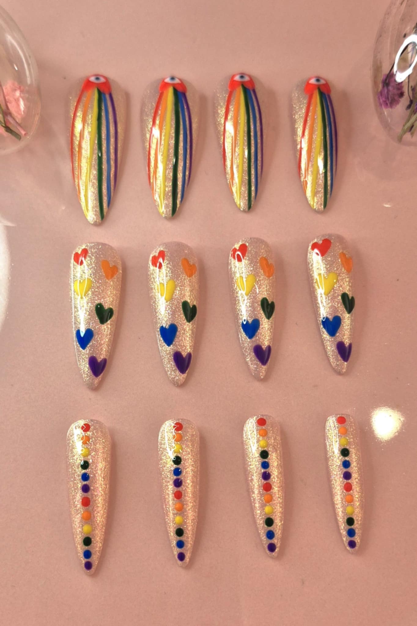 Chaque ongle affiche fièrement une teinte vive de l'arc-en-ciel, associée à de petits motifs festifs : confettis, paillettes, rayures... 🌈