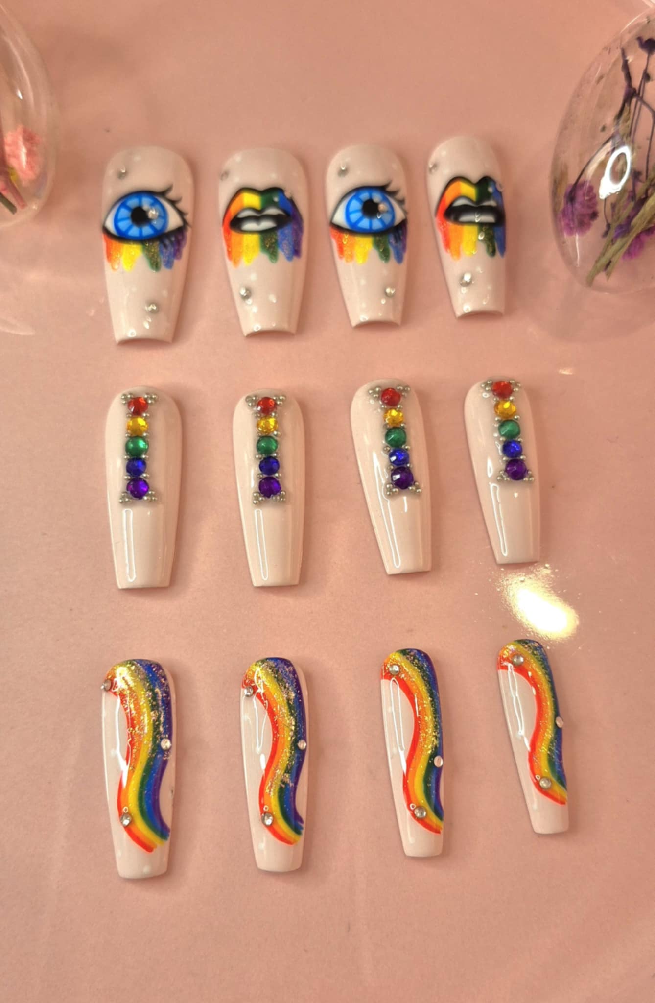 Chaque ongle est un pinceau coloré représentant les nuances de l'arc-en-ciel, parfaitement disposées pour évoquer une fresque moderne sur vos mains 🖌