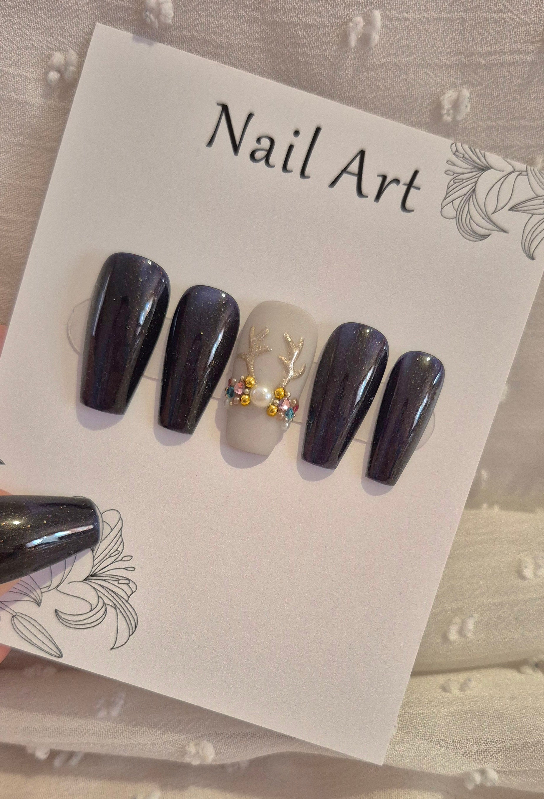 Le noir profond parsemé de fines paillettes crée un effet élégant et sophistiqué, tandis que les bois de cerf apportent une touche naturelle et festive 🦌